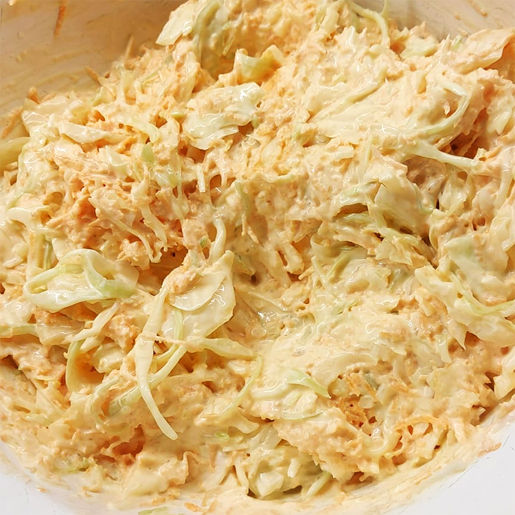 Zuerst das Weißkraut fein hobeln und mit Salz vermengen, die Mischung 1 ½ Stunden stehen lassen um dem Weißkraut die Flüssigkeit zu entziehen.