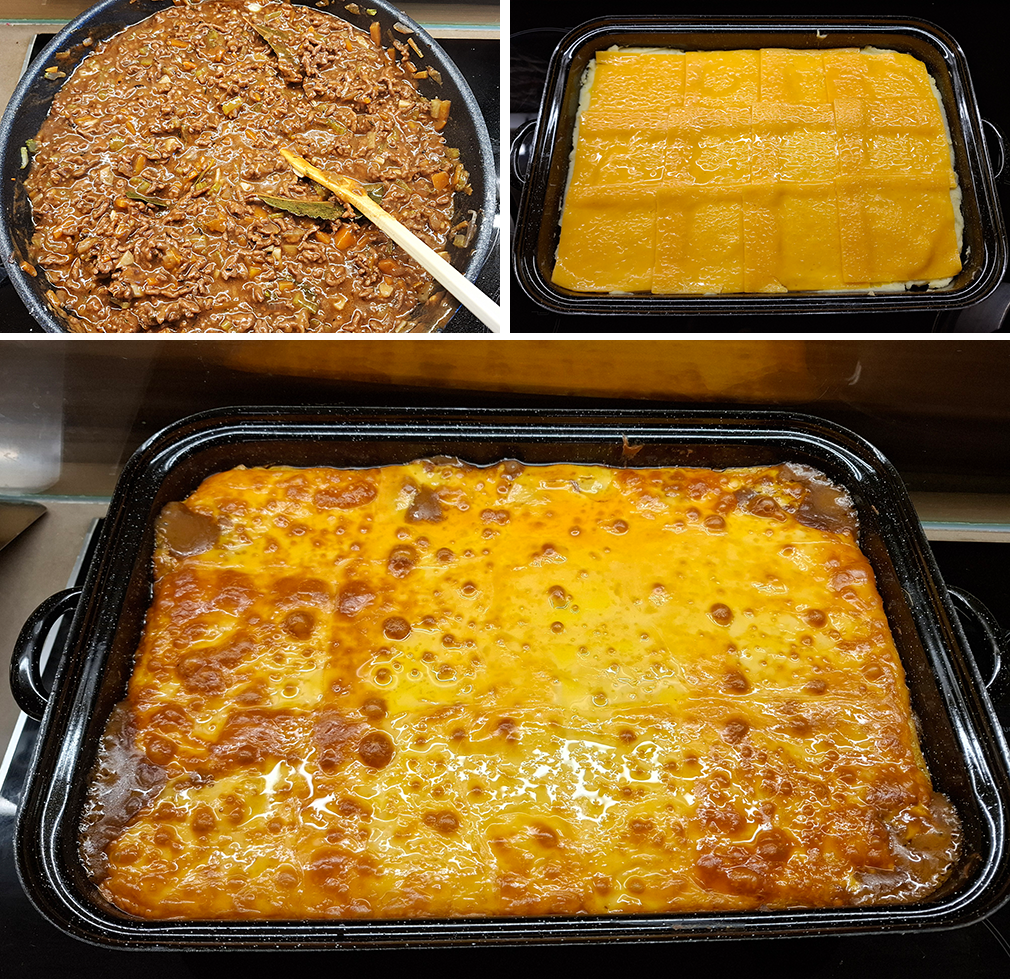 In eine Form geben und mit dem aus den o.a. Zutaten zubereiteten Pürree (mit dem Käse) bedecken und bei 200° Umluft ca. ca.30 min backen bis das Pürree goldbraun wird.