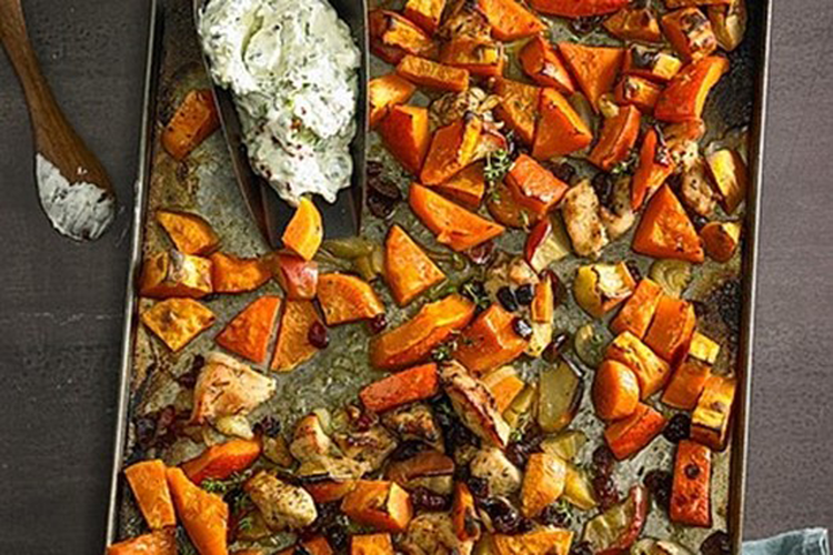 Den Hokkaido, die Süßkartoffel, die Zwiebeln und die Äpfel in 2 cm große Stücke schneiden und in eine große Schüssel geben. Das Hähnchenbrustfilet in etwas größere Stücke schneiden und dazugeben. Die Cranberries ebenfalls dazugeben. Mit 2 EL Olivenöl vermischen. Den Honig und die Gewürze dazugeben und gut, aber vorsichtig umrühren.