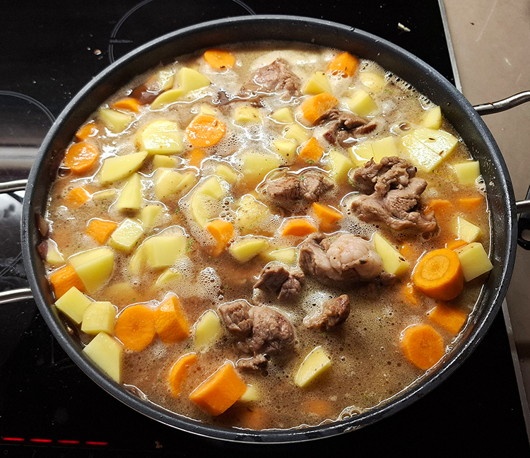 Speckwürfel im heißen Topf auslassen. Zwiebelstücke darin glasig dünsten, dann das Fleisch beifügen und rundherum braun anbraten, Knoblauch darüber streuen. Karotten darauf verteilen, salzen und mit Kümmel bestreuen und als letztes die Erdäpfel einschichten, Jetzt noch die gehackte Petersilie zufügen. Die Fleischsuppe erhitzen und dazugießen. ca. 50 Minuten zugedeckt schmoren lassen, alles vermengen und nochmals mit Salz und Pfeffer abschmecken bzw. würzen.