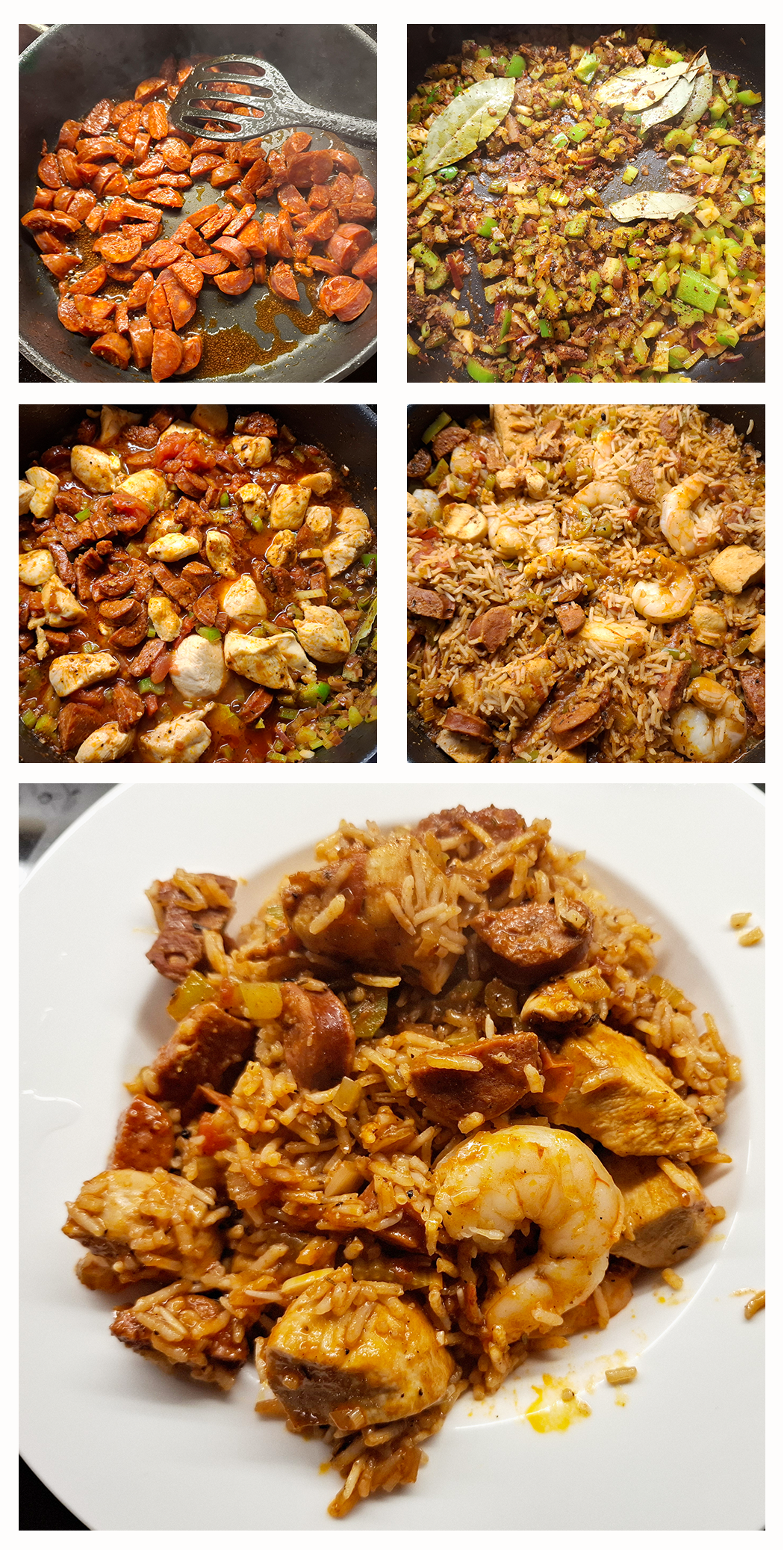 Nicht so oft rühren, damit der Reis nicht matschig wird. Wenn die Flüssigkeit im Topf auf gesaugt und der Reis weich ist, ist die Jambalaya fertig.