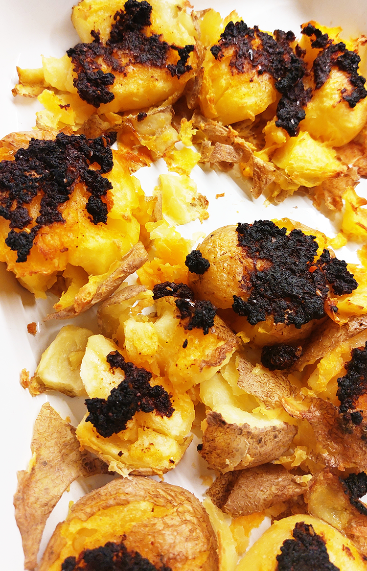 Die Erdäpfel z. B. mit dem Boden eines Marmeladenglases leicht anquetschen, bis die Haut aufplatzt. Dann auf ein Backblech legen und jede Knolle mit der Öl-Tomaten-Mischung bestreichen. Im Ofen 20 Minuten backen, bis sie goldgelb und die Ränder knusprig sind. Dabei das Backblech nach 10 Minuten um 180 Grad drehen.