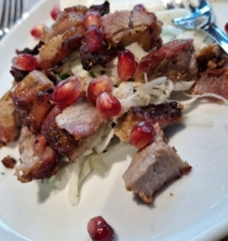 Schopf in 2cm würfel schneiden, mit Olivenöl und Gewürzmischung einreicben, min 30min ziehen lassen, auf Metallspiess aufspießen, Grill auf 180° aufheizen, Spieße direkt 8-10min grillen und mehrfach wenden (oder 20min indirekt), in Streifen vom Spieß schneiden und über den Krautsalat geben.