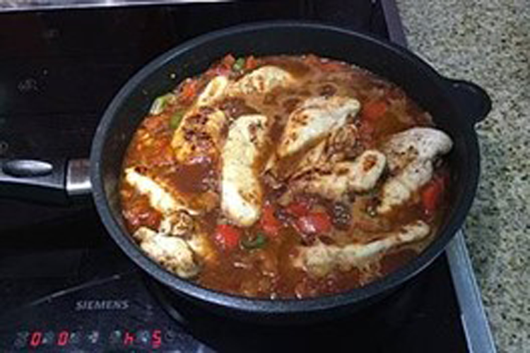 Die Butter in der Pfanne zerlassen und den braunen Zucker darin karamellisieren lassen. Darin die Hähnchenbrustfilets karamellisieren. Die klein geschnittene Paprikaschote mit dem zerhacktem Knoblauch, den passierten Tomaten und dem Rotwein hinzugeben und ablöschen. Mit Salz, Pfeffer, Koriander und etwas braunem Zucker würzen und das Ganze bei kleiner Hitze etwa 40 Minuten zugedeckt schmoren lassen.