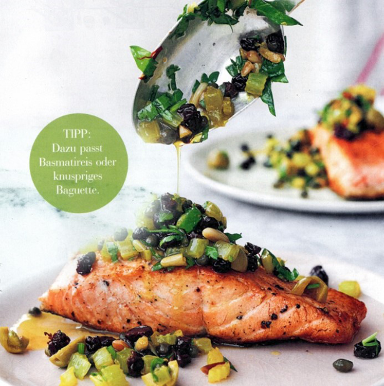 Das restliche Öl in einer großen Pfanne bei mittlerer bis hoher Temperatur erhitzen, die Lachsfilets mit der Haut nach unten einlegen und drei Minuten braten, bis die Haut knusprig ist. Hitze reduzieren, Filets umdrehen und je nach gewünschtem Gargrad weitere 2-4 Minuten braten. Mit der Salsa auf vorgewärmten Tellern anrichten, mit gehacktem Selleriegrün bestreuen..