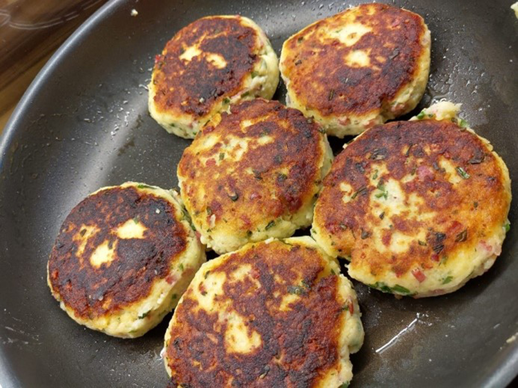 Zwiebel und Speck anrösten, die gekochten und zerpressten Erdäpfel, die feingehackte Petersilie und den Schnittlauch beimengen und abschmecken. Laibchen formen und im heißen Fett ausbacken.