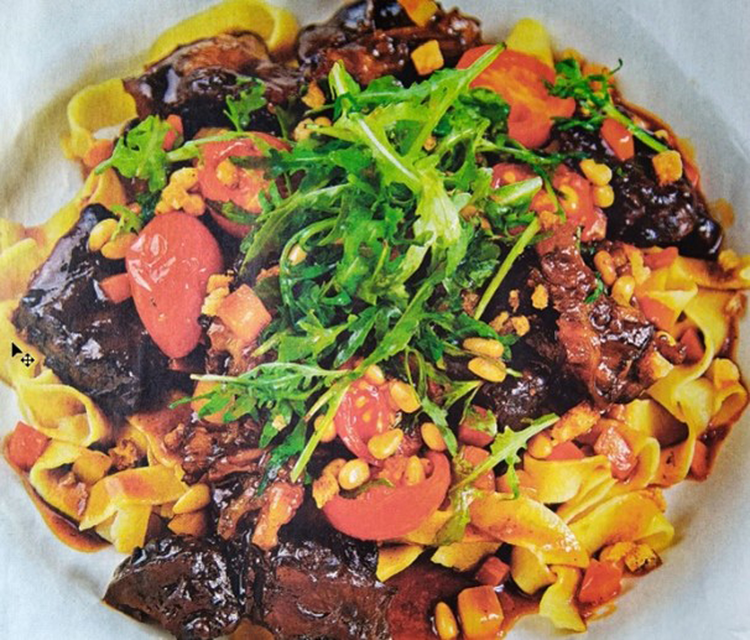Inzwischen Bandnudeln kochen und unter das Ragout mengen. Mit Ofenparadeisern, Pinienkernen und Ruccola garnieren
