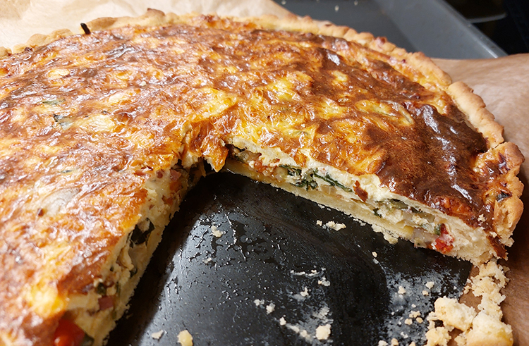 Ich röste zuerst die Fülle an - bzw. anschwitzen, je nachdem es es halt ist, das in den Mürbteig und die Mischung aus Rahm, 3 Eiern und dem Käse drüber. Schlagobers lasse ich weg - nur fett
