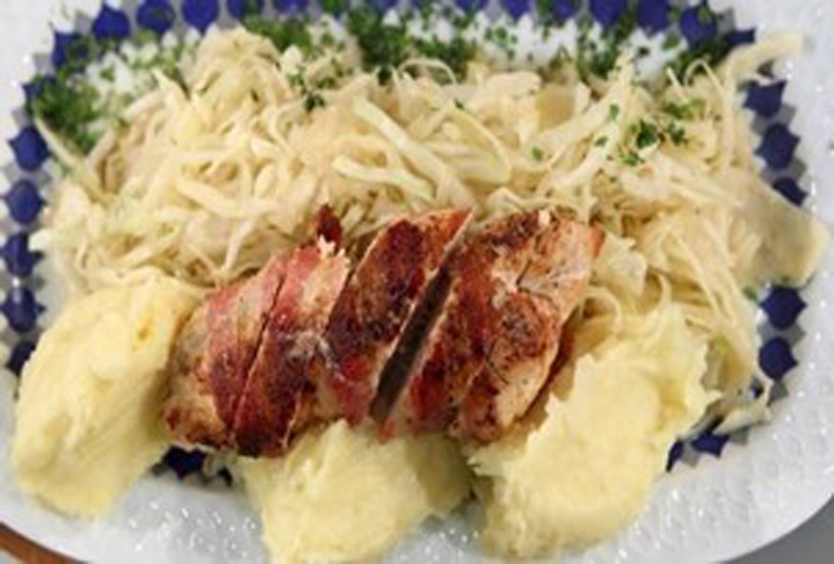 Die Hähnchenbrüste halbieren und zusammen mit dem Kartoffelstampf auf Tellern anrichten. Den Krautsalat dazu servieren.