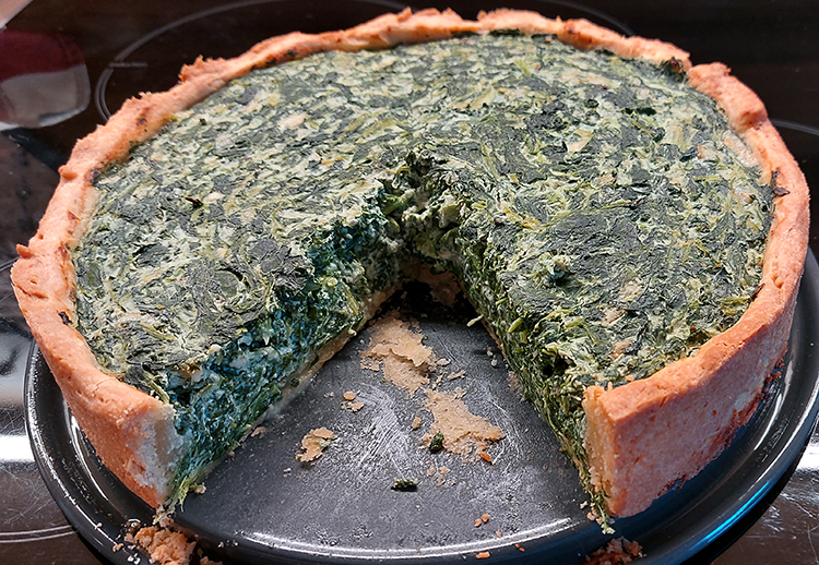 Den Teig Quicheform auslegen, den Spinatguss darübergiessen.