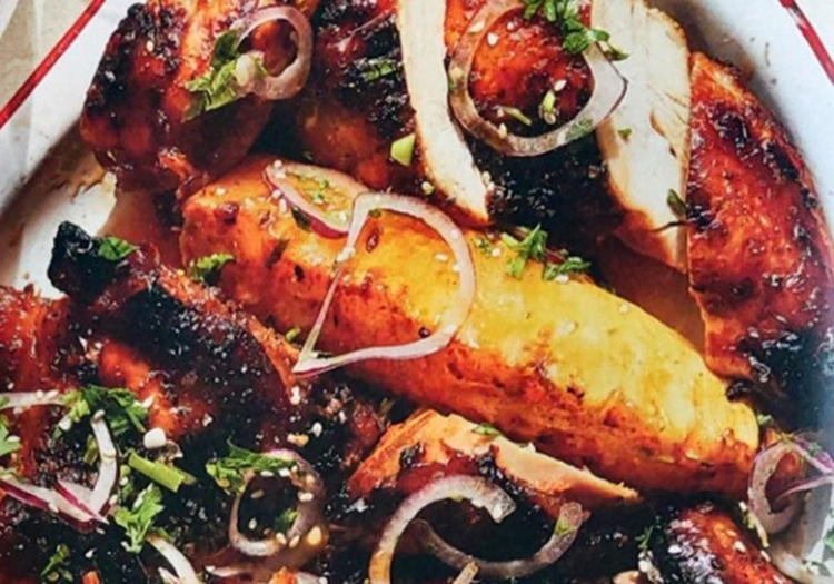 Das Backrohr auf 220 c vorheizen. Das Huhn und die Ananas auf einem Backblech verteilen (eventuell mit Backpapier oder Alufolie auslegen) und die restliche Marinade darüber verteilen. Backen, bis das Huhn und die Ananas eine wunderschöne goldene Farbe haben, etwa 50 bis 60 Minuten. Wer einen Pinsel hat, kann sie währenddessen immer wieder mit den Säften einpinseln.