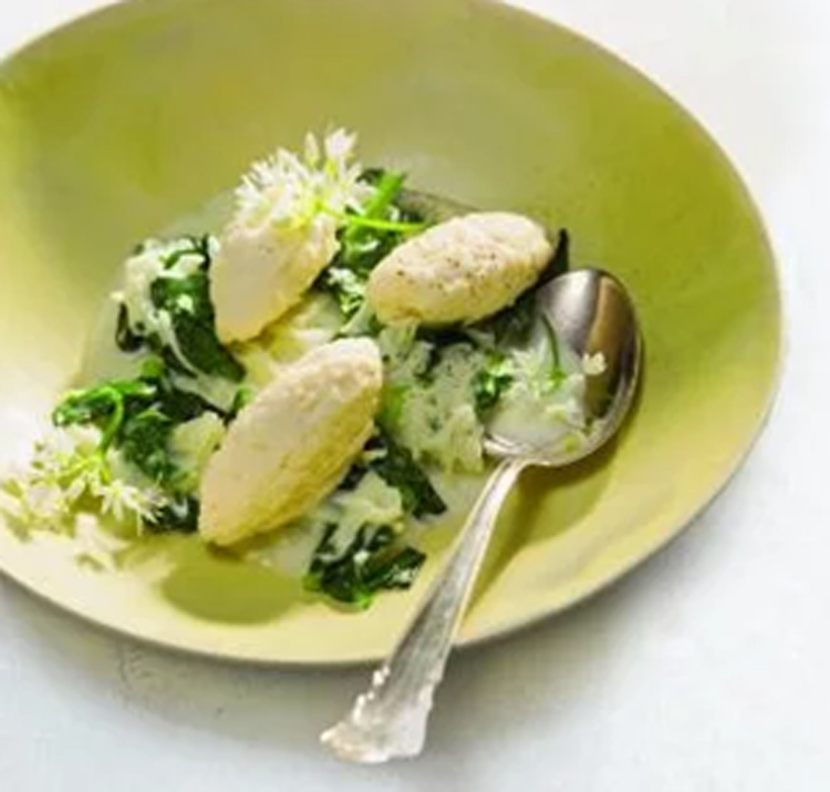 Kräuter abzupfen und fein hacken. Bärlauch in 3–4 cm breite Streifen schneiden. Kräuter und Bärlauch mit dem Joghurt unter den Kohlrabi mengen. Kohlrabi anrichten, Nockerl daraufsetzen, mit frisch abgeriebener Schale der restlichen ½ Zitrone bestreuen.