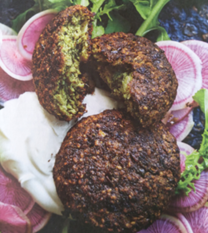 Zwiebel schälen und fein hacken, Kohlblätter und Brokkoli klein schneiden. Petersil und Minzblättchen von den Stielen zupfen. Kichererbsen, Erbsen, Chiasamen, Brokkoli, Kohlblätter, Petersilie, Minze, Kreuzkümmel, Backpulver, Salz und Pfeffer portionsweise im Cutter fein zerkleinern.