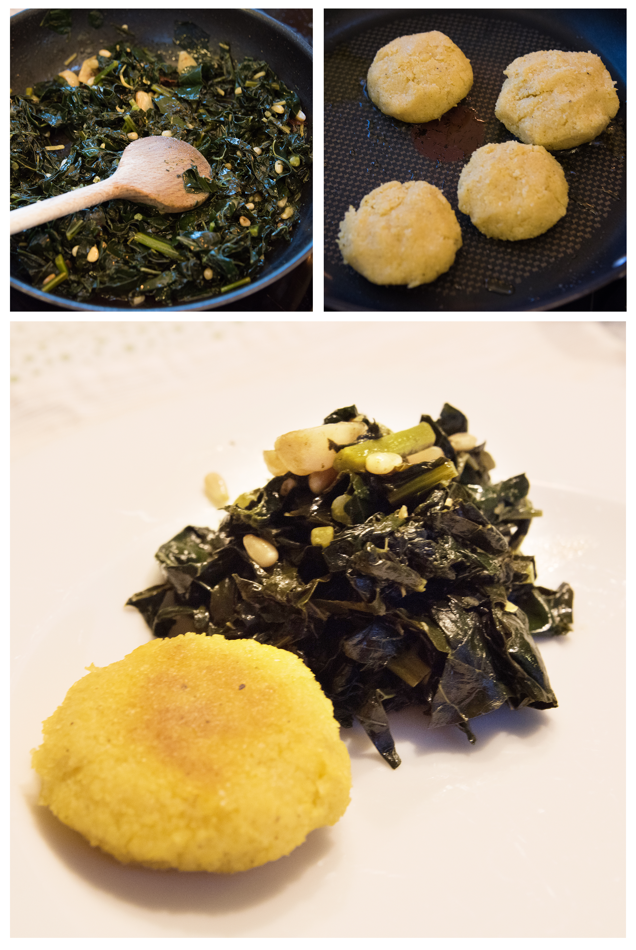 Polenta mit der Hälfte des Olivenöls vermsichen, salzen und pfeffern und so viel Wasser dazu, das es ein krümeliger Teig wird aus dem man Laibchen formen kann, Laibchen formen, Größe nach Lust und Laune.