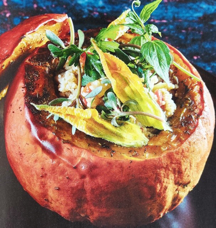 Die Kürbisse mit dem Couscous befüllen, nach Belieben Kräuter, Deckel aufsetzen und servieren.