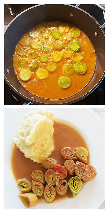 Für die Misosauce alle Zutaten glatt verrühren, über den Lauch gießen und ca. 15 min bei geringer Hitze garen lassen.