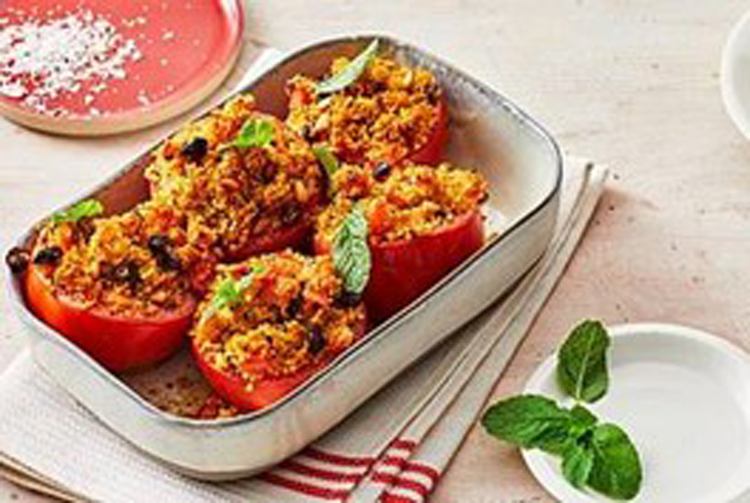Couscous mit zwei Gabeln auflockern und mit allen vorbereiteten Zutaten mischen. Die Mischung in die Tomaten füllen.