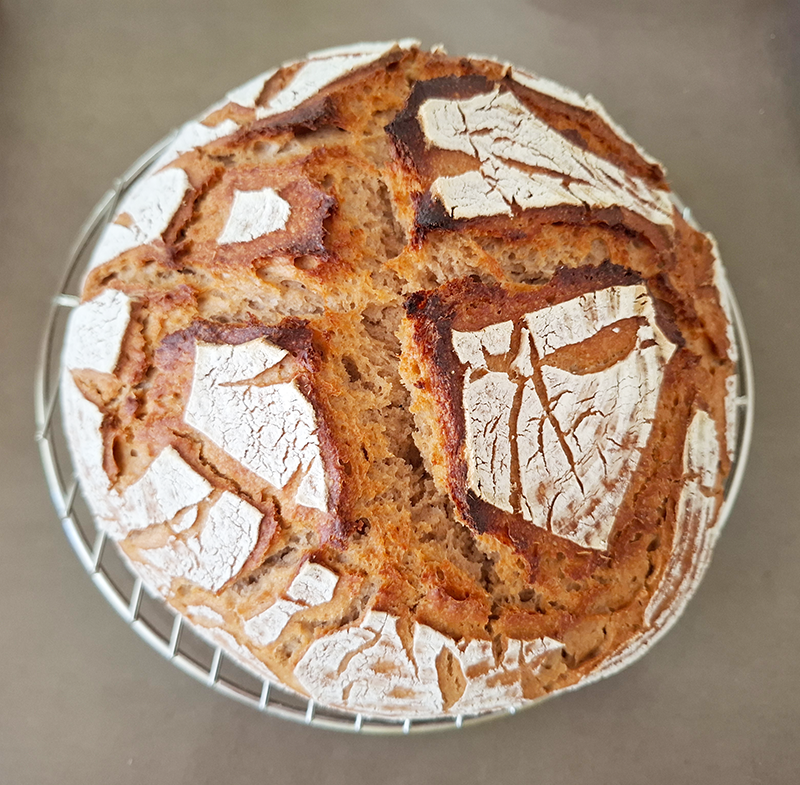 Ofen auf 240° vorheizen mit dem Topf schon drinnen, Brot direkt aus der Kühlung in den Topf, wenn man mag einschneiden für schöne Kruste, 20min zugedeckt backen, dann Temperatur auf 210° reduziren und bei offenem Deckel 15-20min fertig backen, bis Kerntemperatur ca. 96° hat.