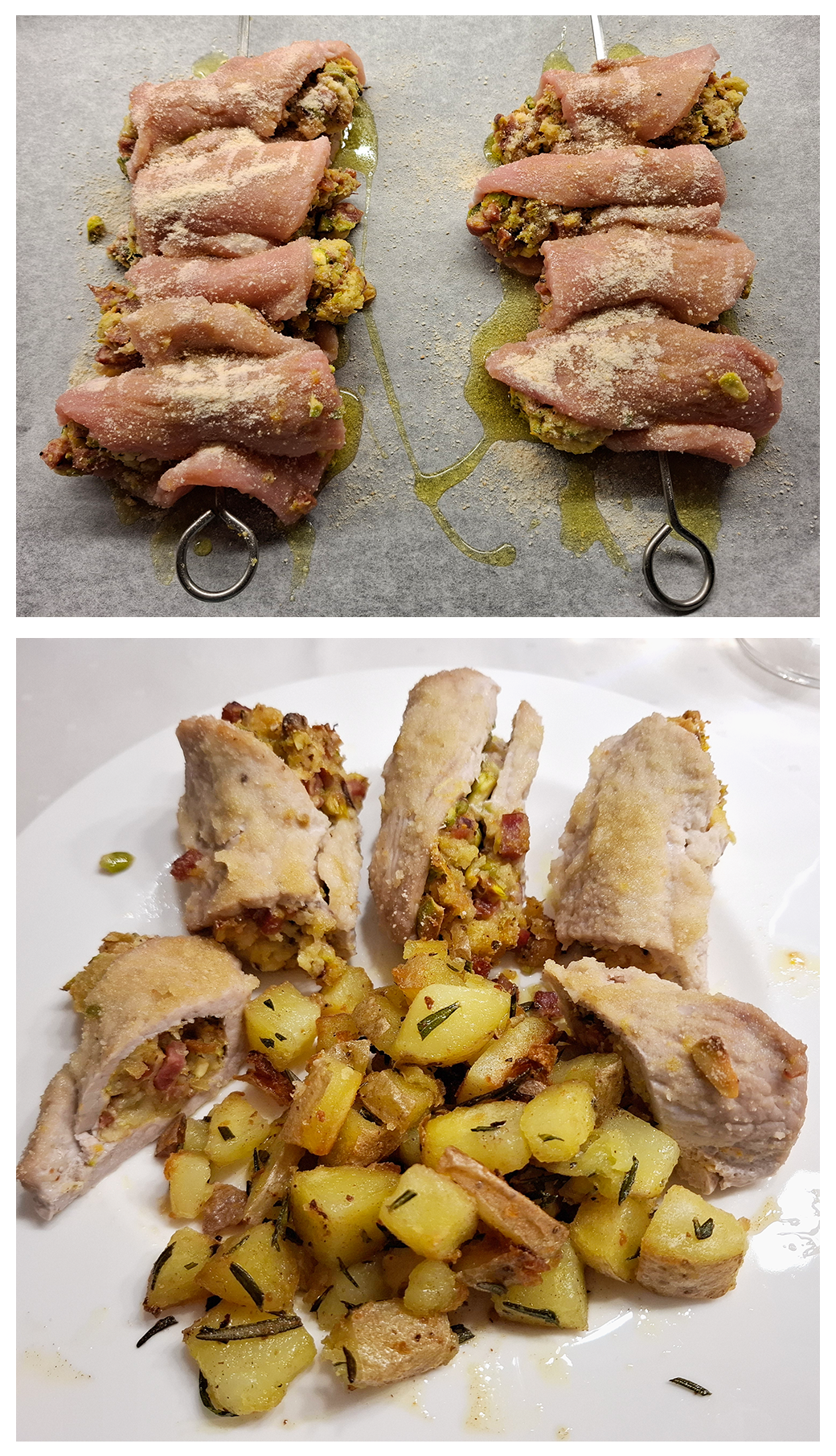 Alle Zutaten für die Füllung mit ausreichend Olivenöl sorgfältig bis es wie ein Teig ist vermischen und auf acht Portionen teilen, zu Würsten formen und in die Hühnerschnitzel wickeln und mit Spießen fixieren und auf das vorbereitete Backblech legen.