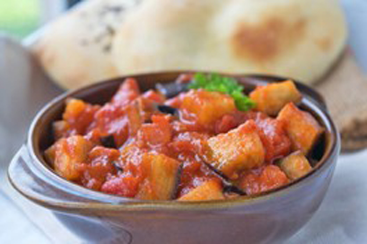 In einer große Pfanne wird das Olivenöl erhitzt und die Melanzani für 2-3 Minuten angebraten. Nun kommen Knoblauch und Zwiebel hinzu und alles wird weitere 5 Minuten angebraten. Tomaten, Minze und die Gemüsebrühe werden ebenfalls hinzugegeben und die Hitze reduziert. Lassen Sie nun alles für 15 Minuten köcheln.