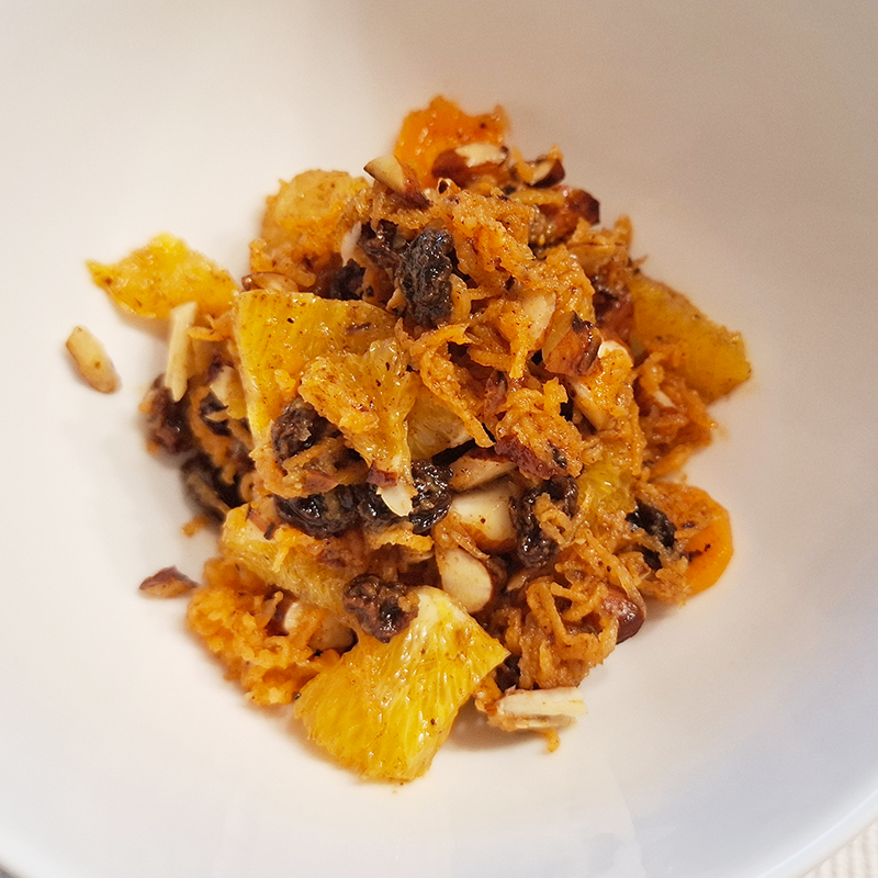 Die Karotten in eine Schüssel füllen. Schale und weiße Haut der Orangen wegschneiden. Die Filets herauslösen und in Stücke schneiden. Mit Rosinen und halbierten Mandeln zu den Karotten geben.
