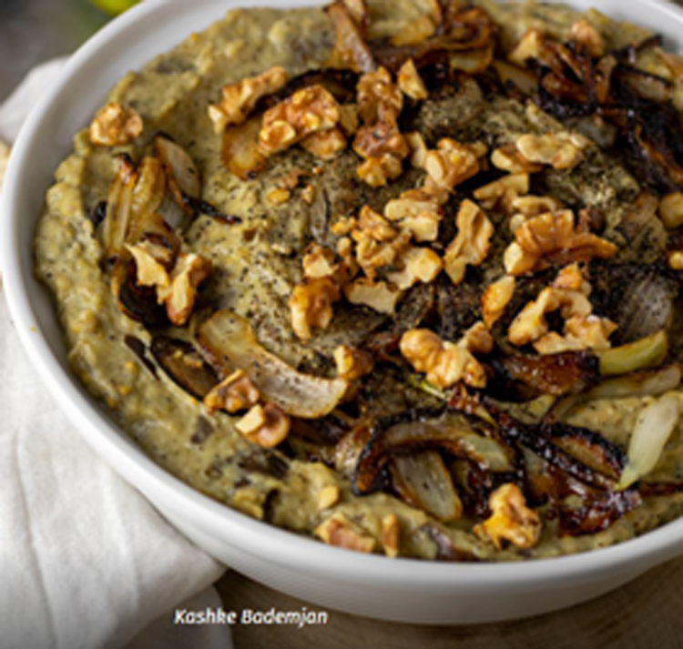 Das Kashke Bademjan mit den Toppings garnieren und mit Fladenbrot genießen.