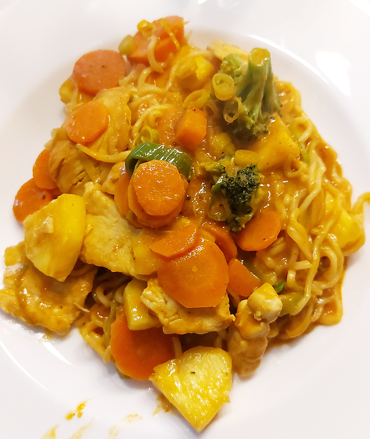 Huhn, Nestnudeln und die Ananas Stücke in die Sauce geben und 3 Min. fertig garen.