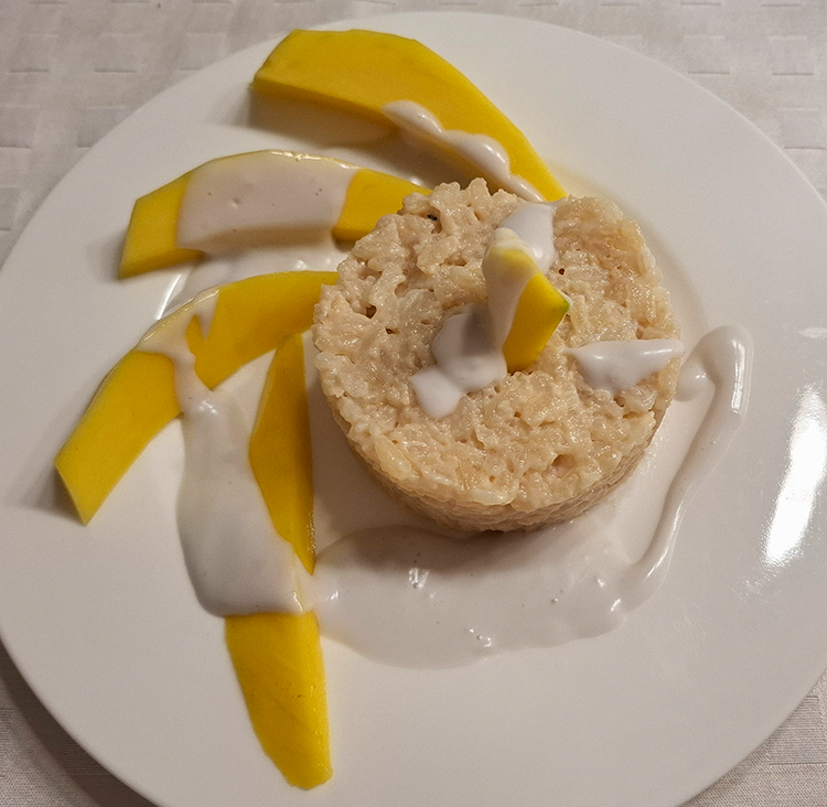 Den Rest der Kokosmilch, 1 EL Wasser, Reismehl und eine Prise Salz verrühren und kurz aufkochen, damit die Sauce leicht dicklich wird. Abschmecken bis die Sauce merklich salzig schmeckt.