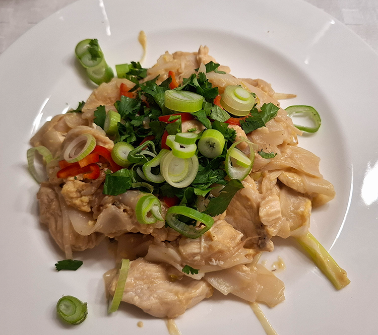 Am Schluss die Erdnüsse dazugeben, auf Teller verteilen, mit Chili, Koriander und dem grünen Teil der Frühlingszwiebel bestreuen und servieren
