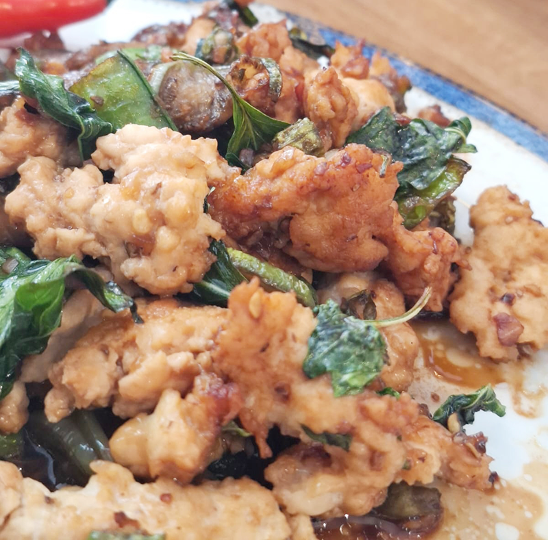 Pfanne erhitzen und das Fleisch mit etwas Öl scharf anbraten. Zucker hinzufügen und das Fleisch braun werden lassen. Anschließend Knoblauch, Chili und Thai-Basilikum hinzufügen und mitbraten.