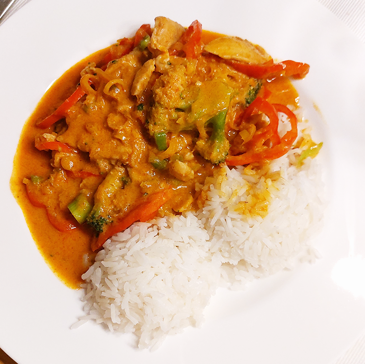 Sojasprossen hinzufügen und das Curry auf Schälchen oder tiefe Teller verteilen. Dazu passt Basmati- oder Thai-Jasmin-Reis.