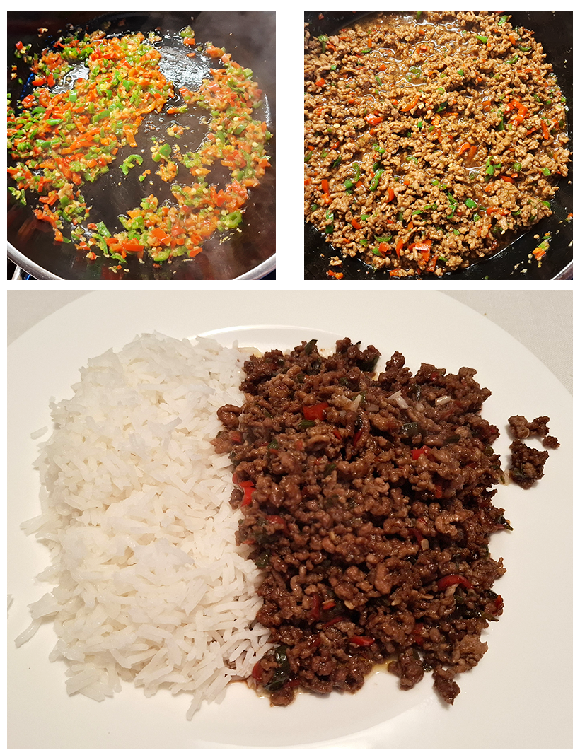 Das Öl bei mittlerer Hitze im Wok heiß werden lassen und die Chilimischung darin 1 Minute pfannenrühren, bis sie duftet. Hackfleisch, Sojasauce und Zucker hineingeben und 3-4 Minuten pfannenrühren, bis das Fleisch gar ist. Die Basilikumblätter hinzugeben, alles gut durchrühren und mit Reis servieren.