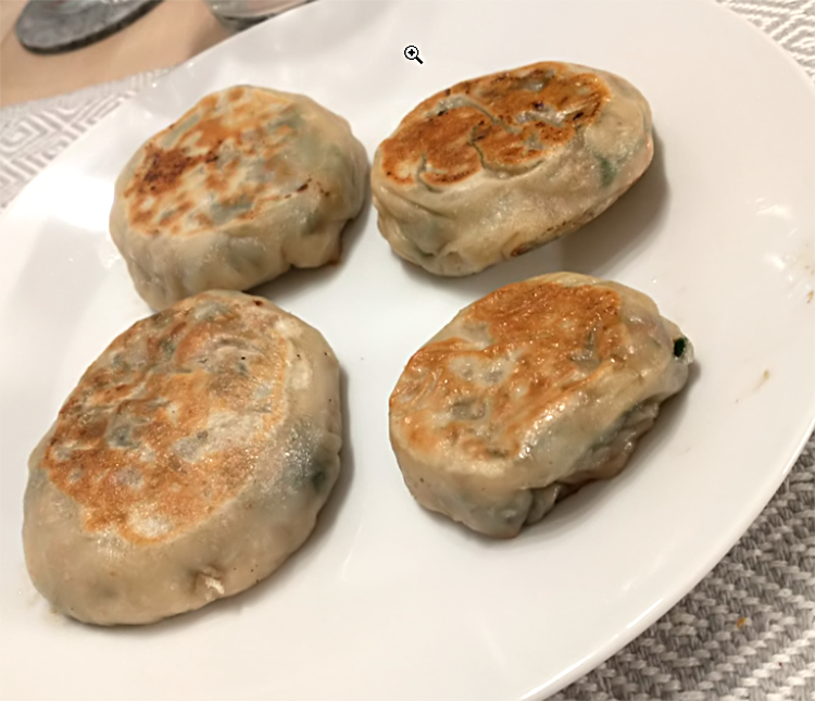 Teigtaschen in einer Pfanne mit wenig Öl auf der ungefalteten Seite 2-3 Min goldbraun anbraten, dann 1/4 l Wasser dazugeben, abdecken, das es dampft und ca. 10 Minuten dämpfen. Herausnehmen. mit Rollerln vom Frühlingszwiebel garnieren und servieren