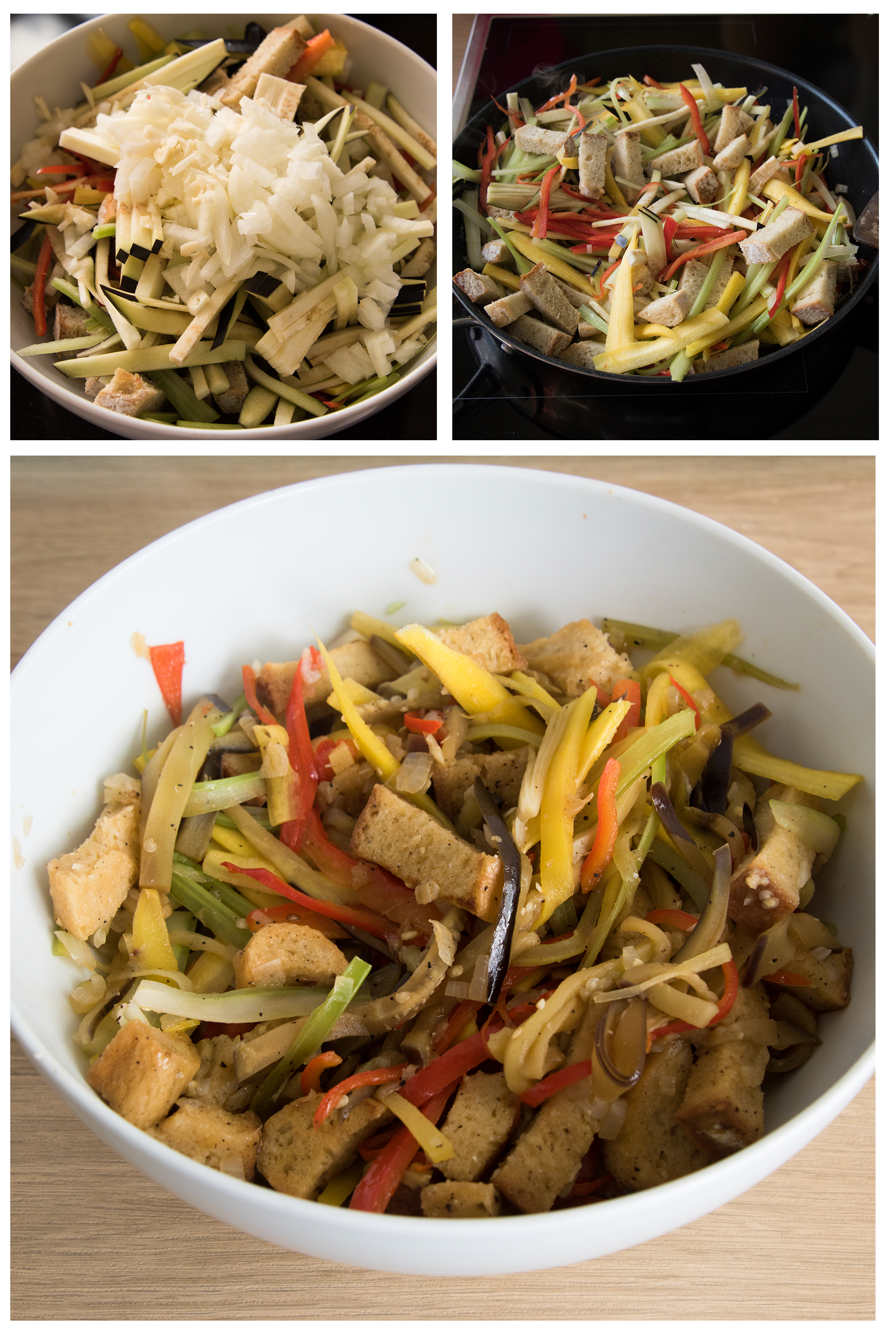 Das Gemüse in feine Streifen schneiden, das Brot in nicht zu kleine Stücke schneiden, alles zusammen mit Olivenöl in einer Pfanne anwärmen und weich werden lassen (ein bisserl Biss darf schon bleiben), mit Essig, Zucker, Salz, Pfeffer würzen und noch leicht ziehen lassen.