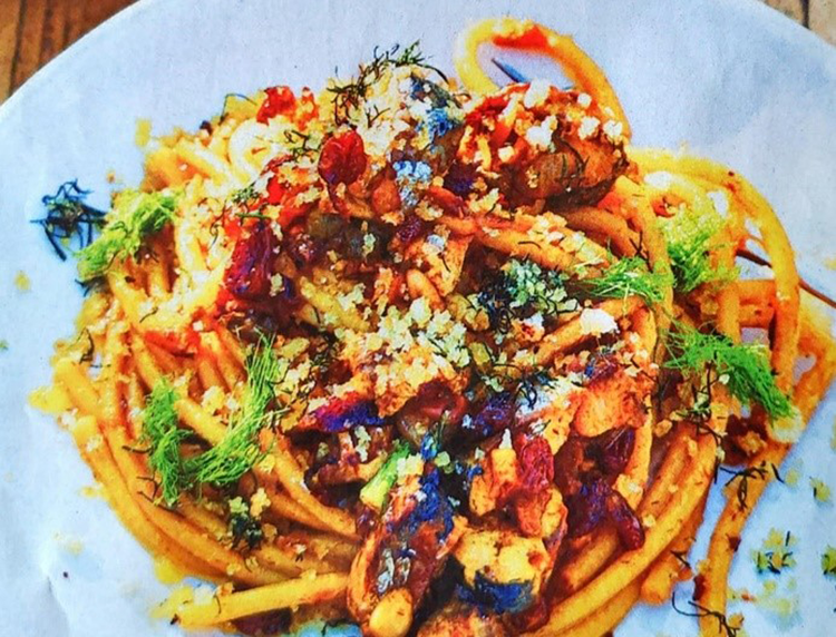 Den Fenchel aus dem Wasser schöpfen und leicht abkühlen lassen. Dann fein hacken und beiseitestellen. Das aromatisierte Wasser leicht salzen und zum Kochen bringen. Die Bucatini darin al dente garen.