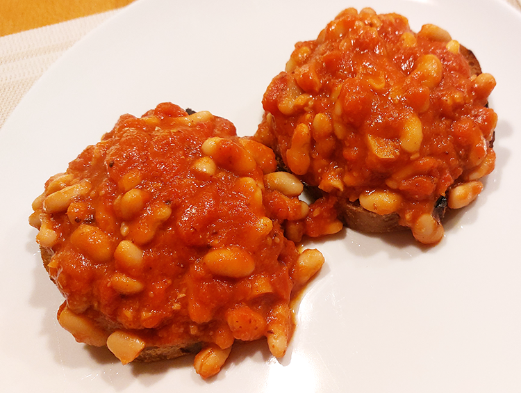 Dann die Bohnen dazu und weitere 5 min köcheln lassen. In der Zwischenzeit das Bauernbrot in Olivenöl knusprig anbraten, auf den Teller legen und die Sauce darüber