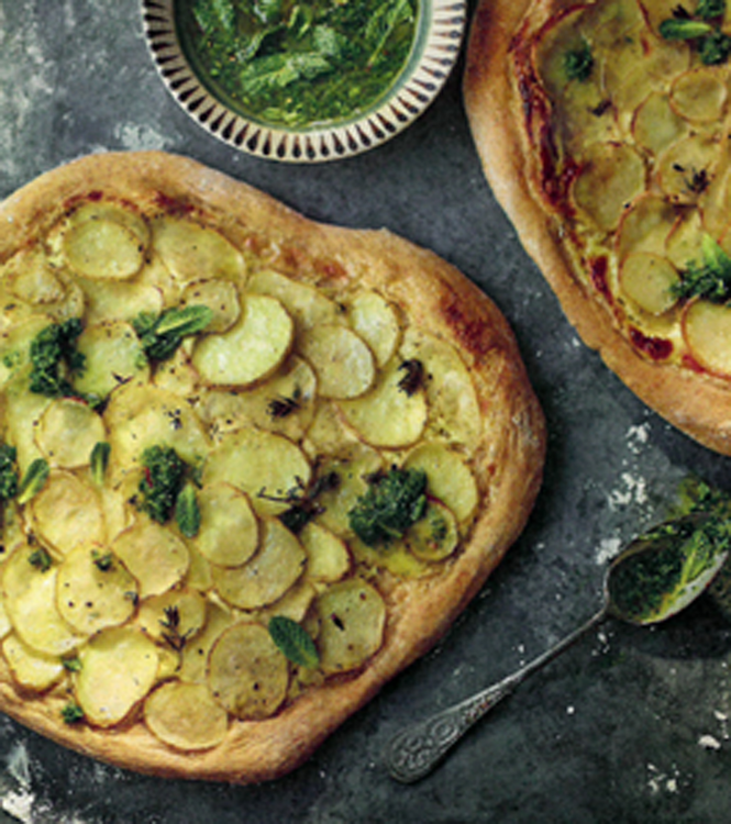 Backofen auf 220° C Ober/Unterhitze vorheizen. Den ausgerollten Pizzateig mit Backpapier auf ein Backblech setzen. Teig eventuell mit etwas zusätzlichem Öl bestreichen, mit Erdäpfeln belegen. 18-20 min auf mittlerer Schiene backen, bis der gewünschte Bräunungsgrad erreicht ist.