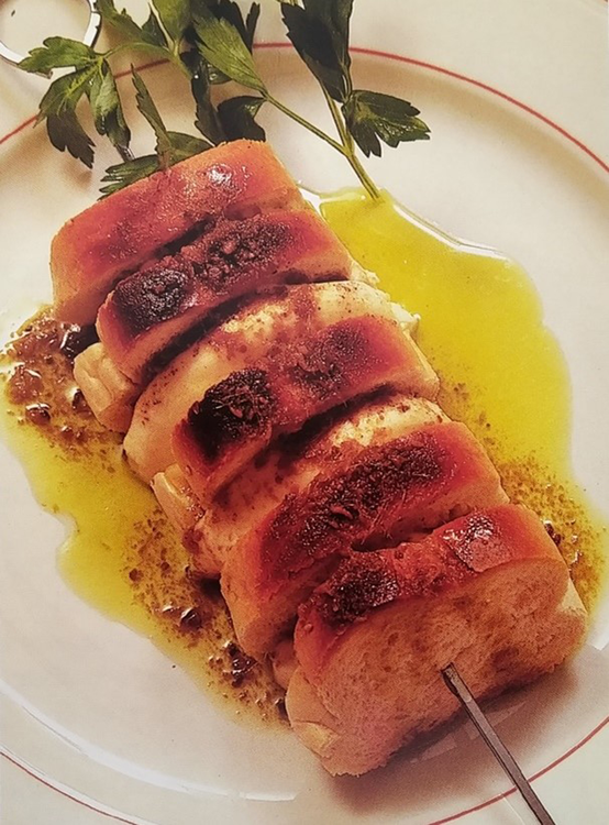 Spieße aus dem Ofen nehmen, auf Teller legen und mit der Butter-Sardellensauce übergießen und mit Petersilie garnieren
