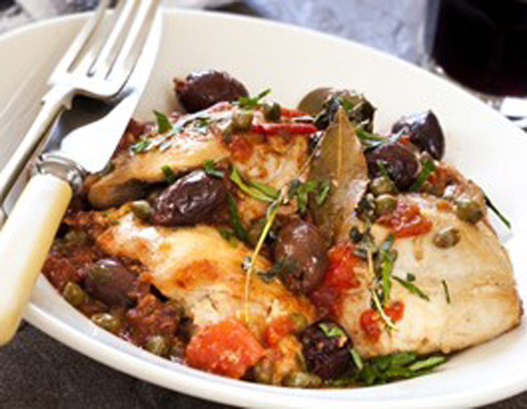 Zwiebeln, Knoblauch und Paprika in der Pfanne anschwitzen und mit Wein und Tomaten aufgießen. Mit Salz, Pfeffer, Lorbeer und Oregano würzen. Hühnerkeulen wieder zurück in die Pfanne geben und zugedeckt bei niedriger Temperatur ca. 45 Minuten schmoren lassen. 5 Minuten vor dem Servieren Oliven hinzugeben. Das Huhn mit Paradeisern und Oregano mit Pasta servieren.