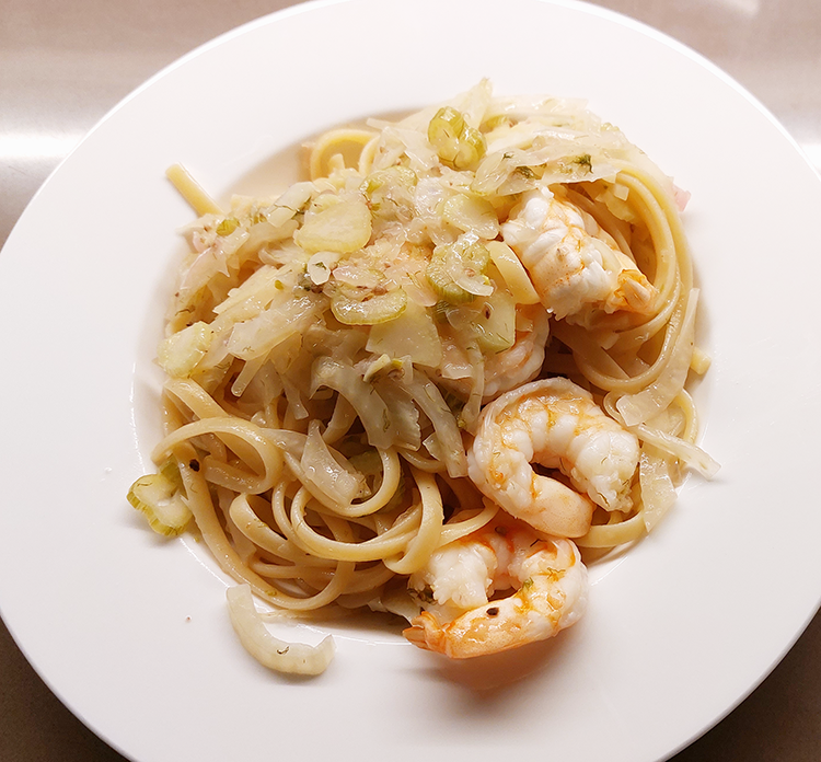 Pasta weichkochen und währenddessen die Garnelen zum fenchel geben und ca. 5 min mitgaren, mit Salz, Pfeffer (ideal weißer Kambot) und dill würzen, Linguine mit Sauce mischen und servieren