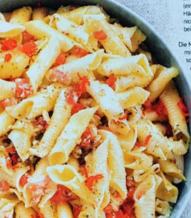 Die Mischung mit dem Olivenöl aufgießen, gut mischen. und die zerquetschten Tomaten untermischen. Die Pasta al dente kochen und vor de Abgießen ein Glas Kochwasser zurückbehalten