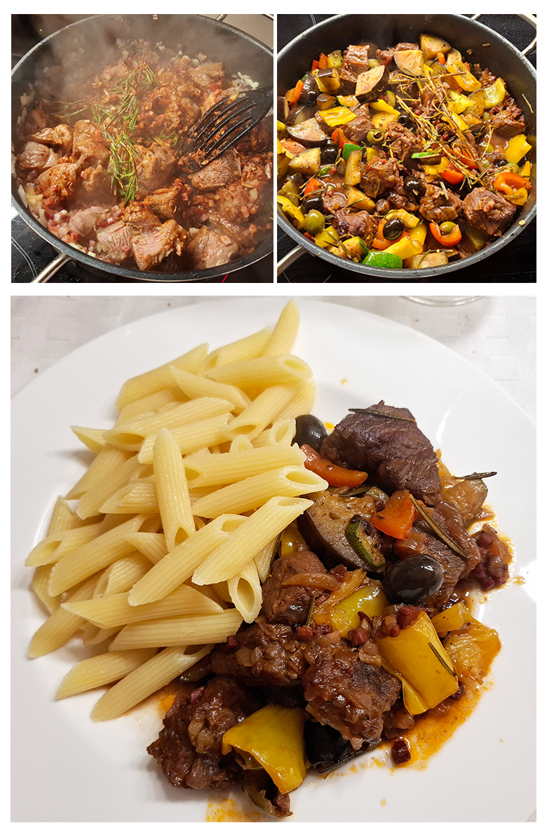 Im Bräter in 2 Portionen Fleisch unter Rühren scharf anbraten. Oliven, Knoblauch, Tomatenmark, Speck- und Zwiebelwürfel hinzufügen und ca. 2 Minuten bei mittlerer Hitze anschwitzen. Mit Rotwein aufgießen, Rosmarinzweig zugeben und zugedeckt im vorgeheizten Backofen (E-Herd: 200 °C/ Umluft: 175 °C/ Gas: Stufe 3) ca. 1 Stunde schmoren.