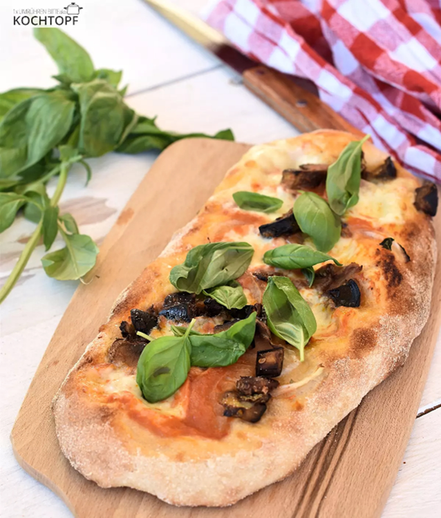 Teig auf einer bemehlten Arbeitsfläche oder Pizzaschieber oval ca. 1 cm dick ausziehen.