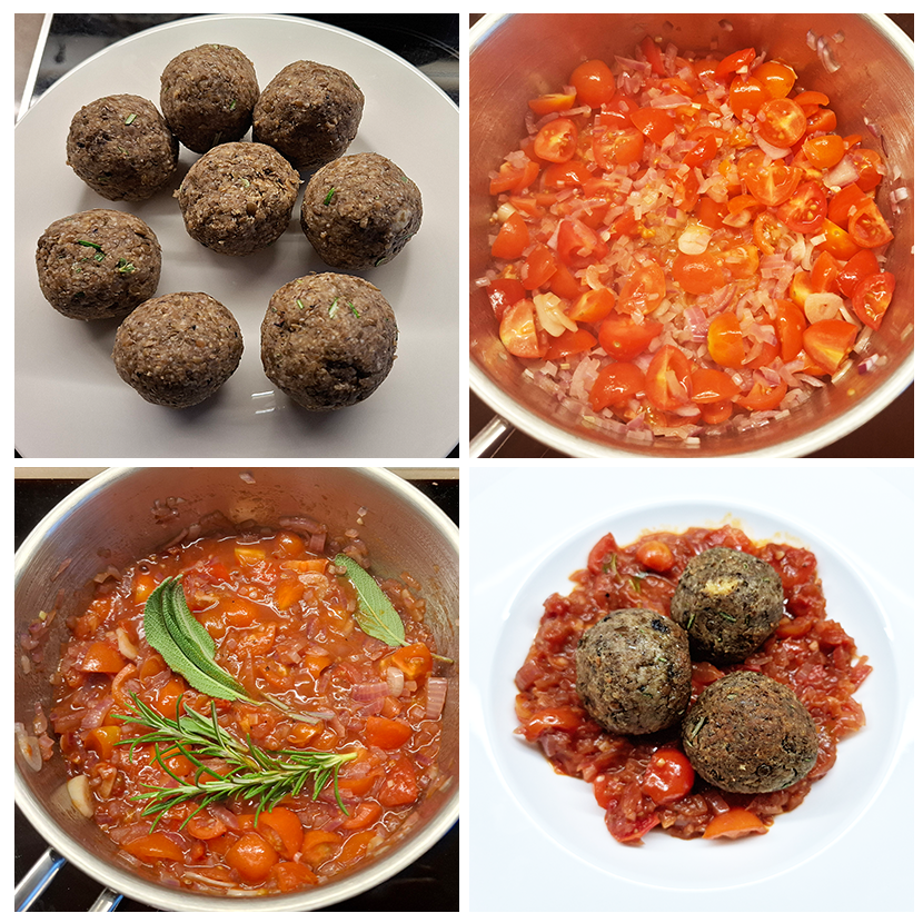 Zwiebel und Knoblauch in Olivenöl anschwitzen, Paradeismark, Wein und Kräuter dazugeben und min 20 Minuten köcheln lassen, dass die Paradeiser ihre Süsse entwickeln. Währenddessen Olivenöl nicht zu stark erhitzen und die Bällchen rundum sanft anbraten,