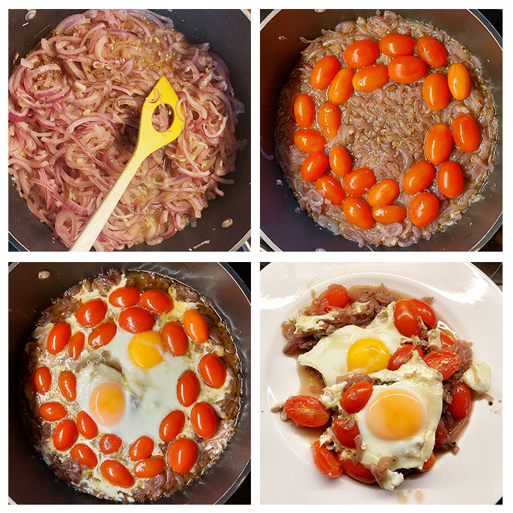 Den Deckel abnehmen und mit einem Holzlöffel vorsichtig die Zwiebelmasse in Viertel einteilen. Auf jedes Viertel ein Ei schlagen, den Deckel wieder auflegen und etwa 5-7 Minuten sanft weiterschmoren, bis die Eier gestockt sind.