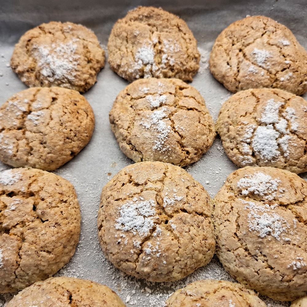 Aus dem Teig Kugeln formen und im Staubzucker (was übrig ist) wälzen, auf das Backblech mit Backpapier setzen, leicht flach drücken und bei 190° (vorgeheizt) ca. 10-15 Minuten backen.