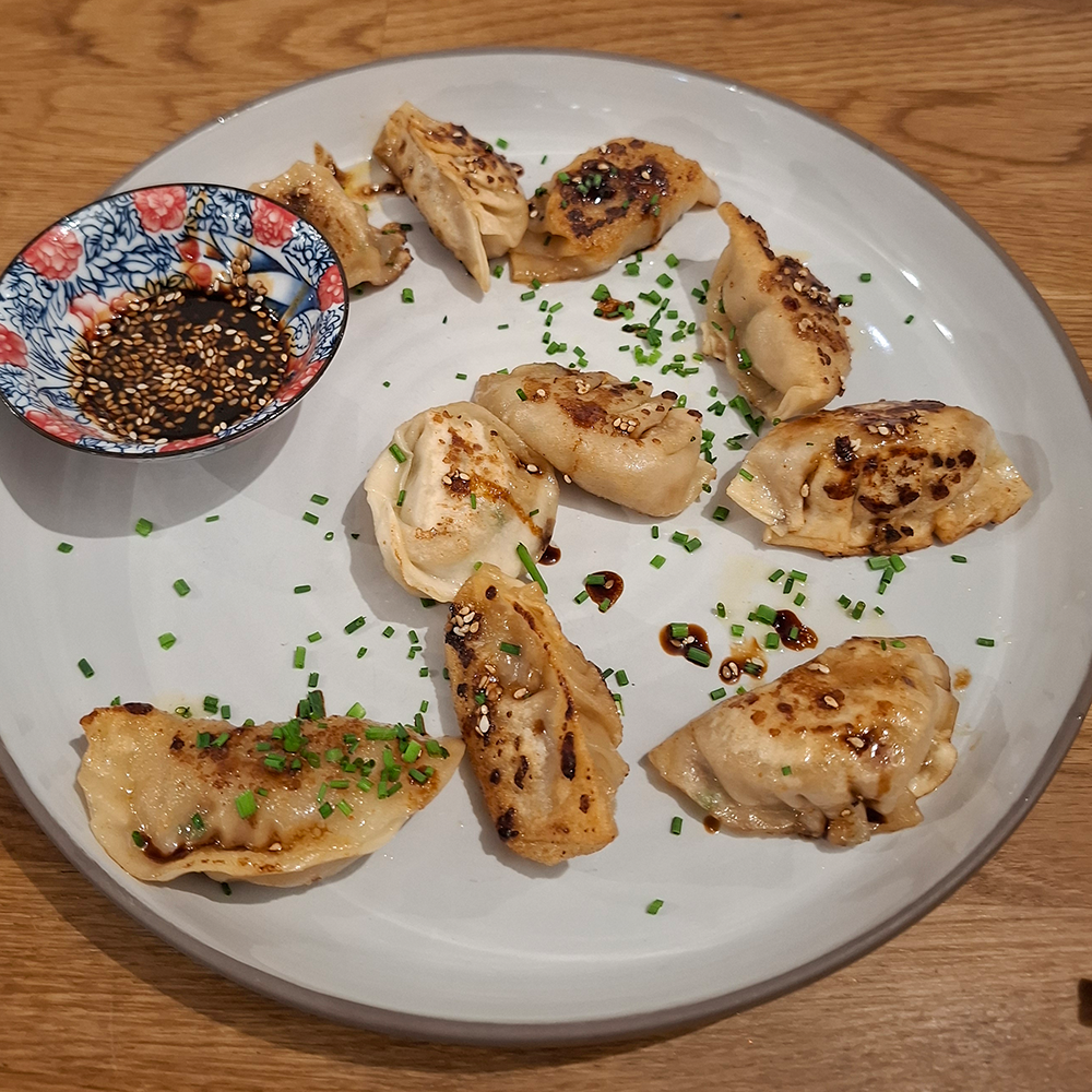 Ca. 1-2 EL auf die Teigblätter und mit Wasser „zukleben“. In einer heißen Pfanne gut anbraten und ein wenig Wasser dazugeben, zugedeckt kochen bis das Wasser verdampft ist. Deckel runternehmen, Wasser ganz verdunsten lassen und mit dem Dip auf einem Teller servieren.