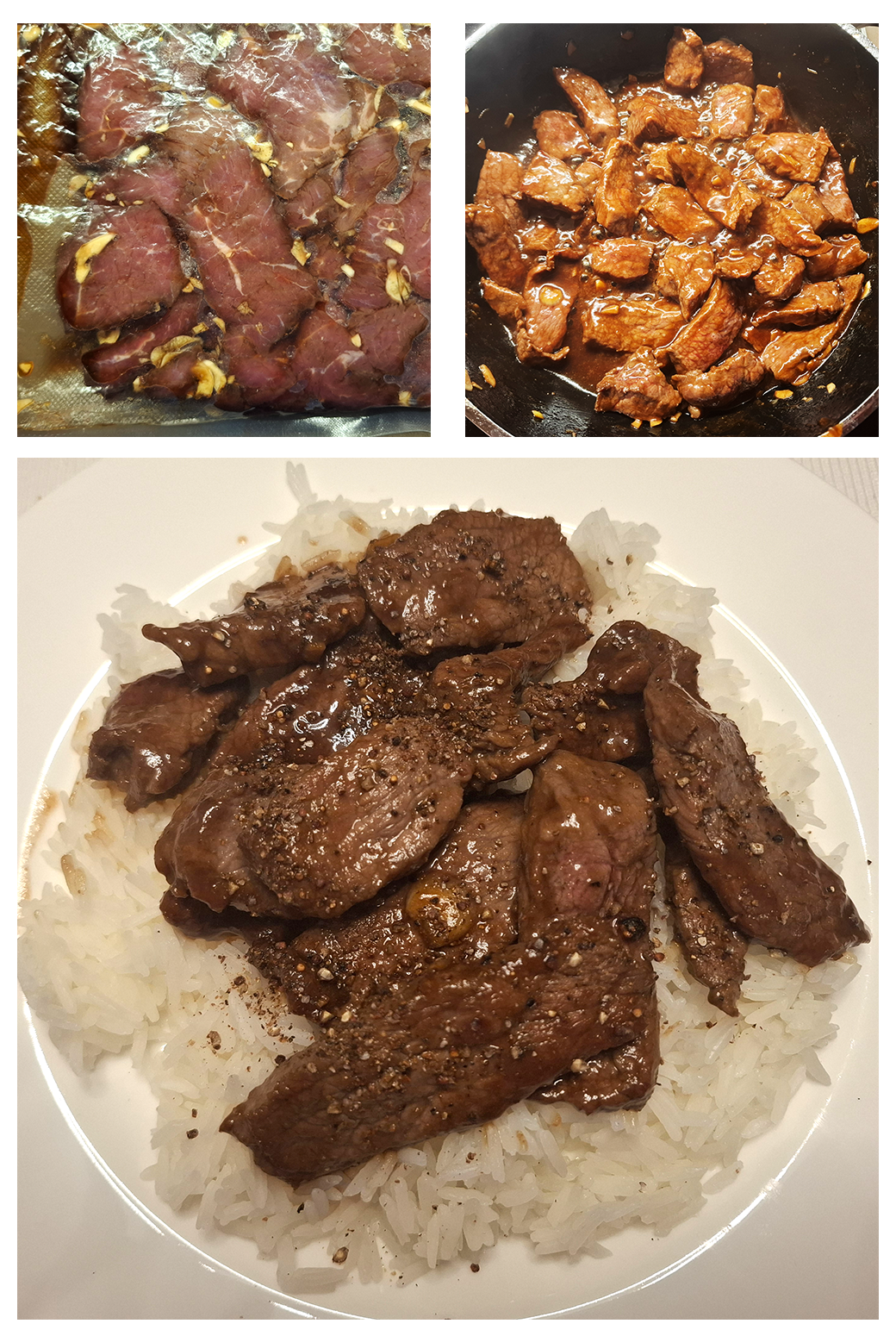 Das Rindfleisch quer zur Faser in etwa fingerlange, dünne Streifen schneiden. Mit Mononatriumglutamat, schwarzer Sojasoße und gehacktem Knoblauch in eine kleine Schüssel geben, gut durchmischen und mindestens 20 Minuten oder über Nacht im Kühlschrank ruhen lassen (ich mische es durch und vakuumiere es.)