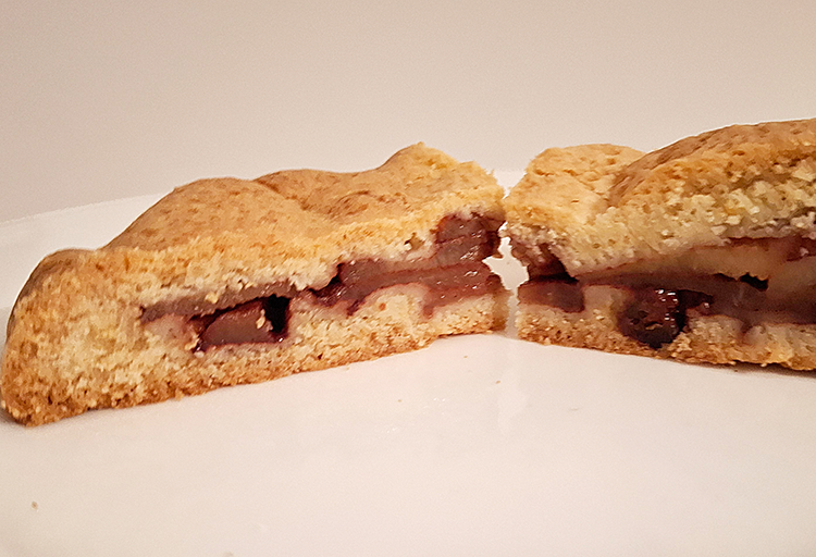 Auf einer Hälfte die Apfelmischung verteilen, mit der 2. Hälfte zudecken und am Rand fest zusammendrücken, dass der Saft drinnen bleibt.
