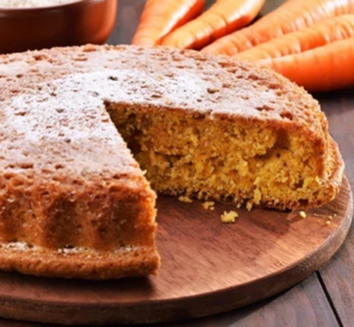 Karotten schälen und fein reiben. Die fein geriebenen Karotten mit Salz, der geriebenen Orangenschale, Mehl, Mandeln und Backpulver mischen.